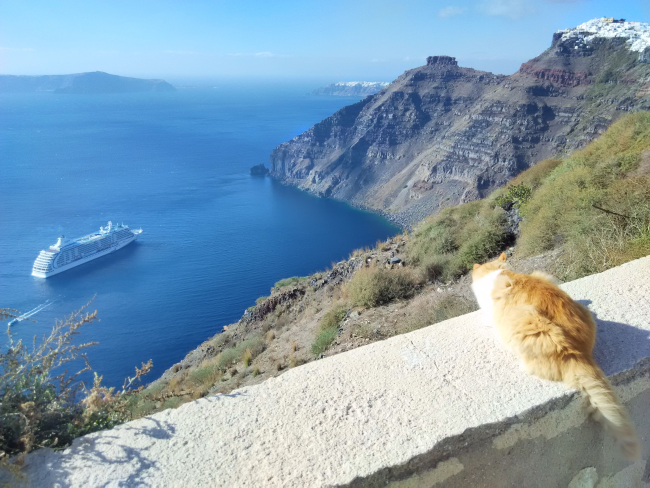 這是在聖托里尼著名的明信片景點旁邊,因為這個景點其實就只有一棟特別的圓頂建築,附近沒有其他的景點,但大眾交通又必須一小時才有一班,所以就只能在景點旁打轉,正好看到這隻貓在圍牆邊,而海上正好有一艘遊輪,就趕緊拍下這神奇美麗的畫面,只記得下一秒貓咪就跳下去消失不見。