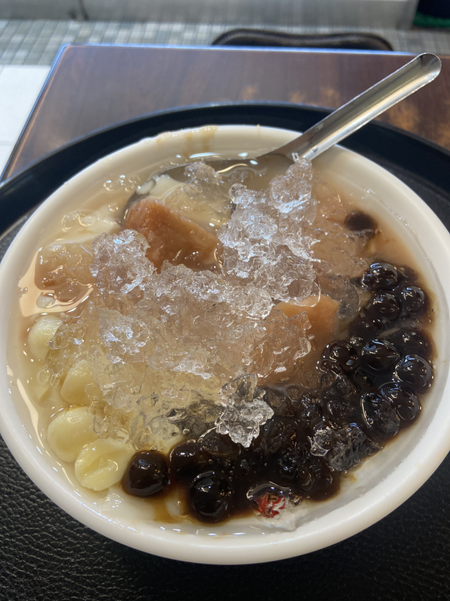 這是在基隆廟口的三兄弟豆花,我點他的招牌芋頭蓮子加粉圓豆花,特色是他的冰塊是用碎冰,而且豆花非常綿密豆香味十足,最特別的是他可以加檸檬糖水,以前他其實只是一個路邊攤小店,現在變成一間很有規模的甜點店,芋頭軟酪香甜,蓮子不會煮到太軟了,而且還有一點點微苦的苦心,粉圓真的是超級好吃,非常推薦大家