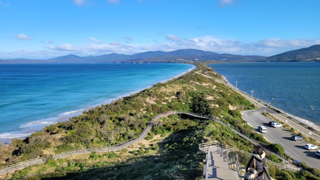 這張照片拍攝於澳洲塔斯馬尼亞布魯尼島的 The Neck Lookout。 那天寒風凜冽,帶著海的氣息,從停車場沿著木棧道一步步往上走,視野隨著高度逐漸開闊。當我站上觀景台的那一刻,眼前的景象讓人屏息——狹長的沙洲連接著南北布魯尼島,左側是深邃的塔斯曼海,右側是平靜的內海,兩種不同的藍色在陽光下交錯出一幅壯麗的畫。 風拂過臉頰,浪聲在耳邊拍打,那種寧靜與遼闊讓人暫時忘了時間的存在。離開前回頭望去,蜿蜒的木棧道上仍有旅人緩步前行,在天地之間顯得渺小而自由。我想,這就是旅行最迷人的時刻——當你什麼都不做,卻感覺被世界溫柔地擁抱著。