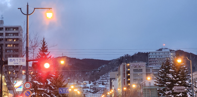 橘黃色的路燈將日落後的小樽增添一抹色彩